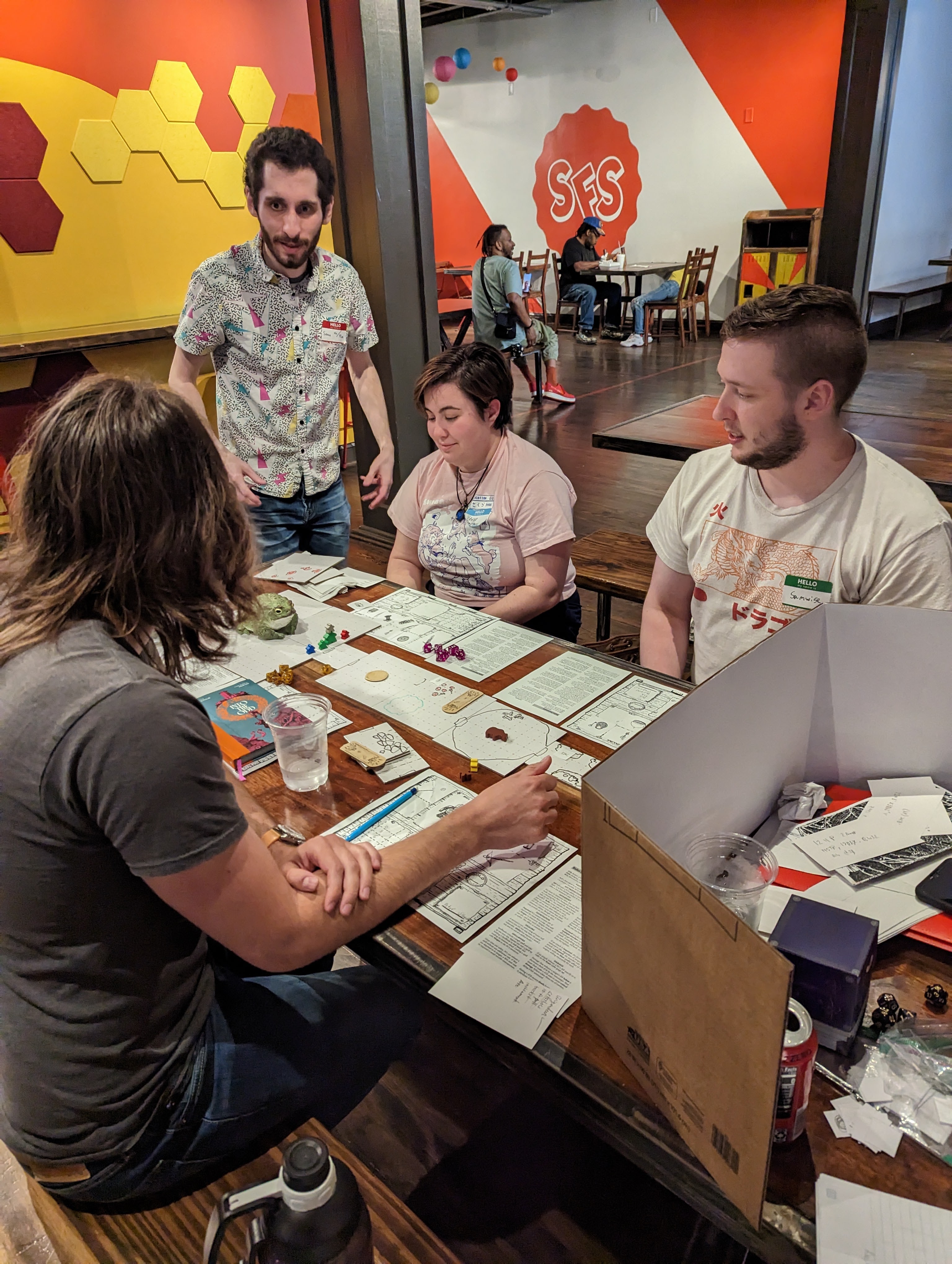 Cross table events, group improv, prizes, experimental systems, and more. Think of a shared quest board for 50 players!